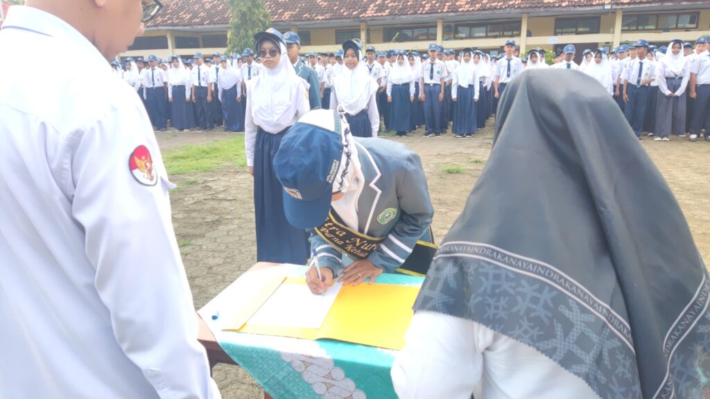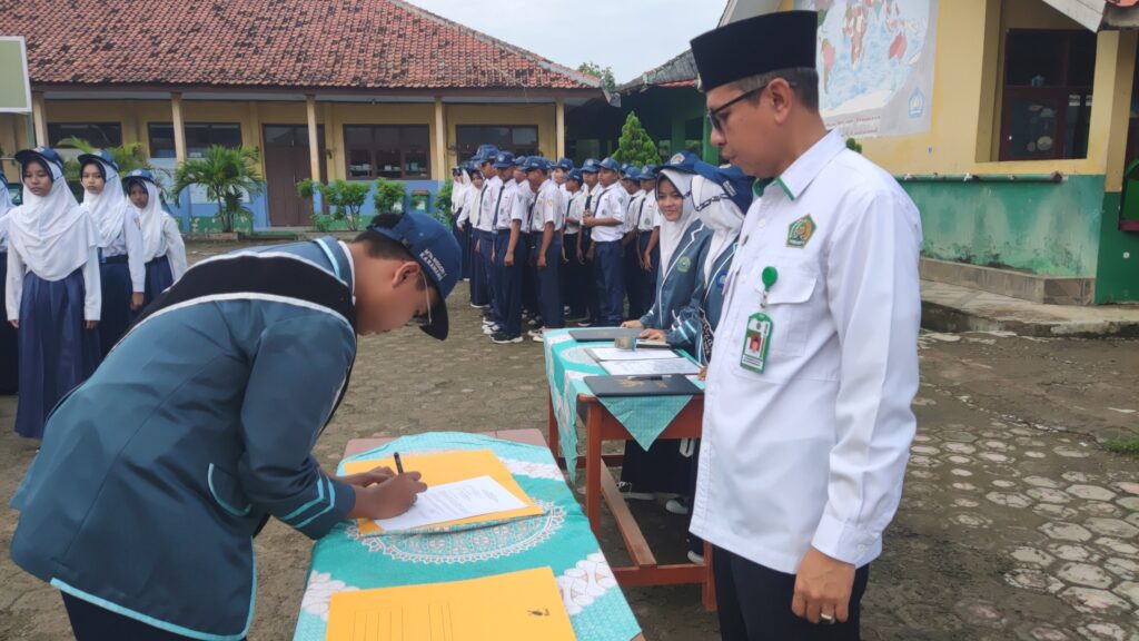 KARAWANG – Mengawali hari pertama masuk madrasah pasca-libur Lebaran Idul Fitri 1447 H, MTsN 1 Karawang menggelar upacara pelantikan pengurus Organisasi Siswa Intra Madrasah (OSIM) dan Majelis Permusyawaratan Kelas (MPK) masa bakti 2025/2026 pada Senin (30/3/2026). Prosesi khidmat yang berlangsung di lapangan utama ini menandai estafet kepemimpinan baru sekaligus menjadi momentum penguatan karakter disiplin dan religius bagi seluruh siswa di lingkungan madrasah.